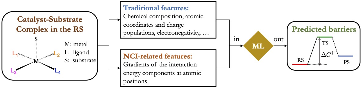Our lab will develop both physically motivated and data-driven approaches to help understand the role of NCIs in molecular catalysis and to facilitate the modular design of new catalysts leveraging these interactions. We will introduce a new interaction partitioning scheme that can precisely identify how each specific part of a catalyst contributes to the stabilization of the transition states. This will be able to tell us which part of the molecular catalyst should be modified and how this modification might look like. We will then leverage ML to accelerate the screening of candidate catalysts with the prediction of reaction barriers using reactant state properties, including those obtained from the decomposition of substrate-catalyst interactions. In addition, to facilitate the experimental verification of catalyst design leveraging NCIs, we will build quantitative or semi-quantitative maps between spectroscopic shifts and physical descriptors of NCIs that can be obtained from calculations.