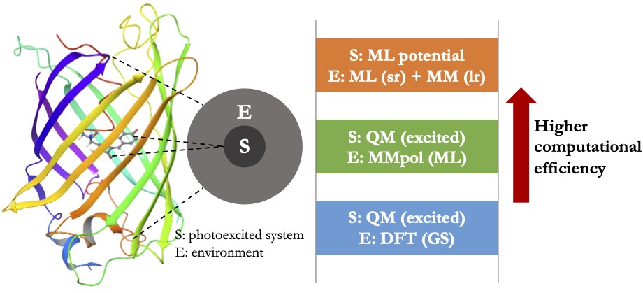 Our goal is to construct accurate PESs that can be utilized for efficient on-the-fly dynamics simulations of excited-state processes in condensed-phase environments. Using these simulations, we aim to elucidate the effects of the environment on photochemical processes and provide microscopic details for the interpretation of time-resolved spectroscopy. To achieve this, we will develop a hierarchy of multiscale modeling methods ranging from quantum mechanical (QM) embedding theory to ML-assisted PESs (Figure 2). These developments will offer a powerful toolbox for modeling excited-state systems in complex environments at different levels of accuracy and computational cost, facilitating our understanding of how important light-driven chemical processes can be modulated and controlled by modifying the chemical environment.